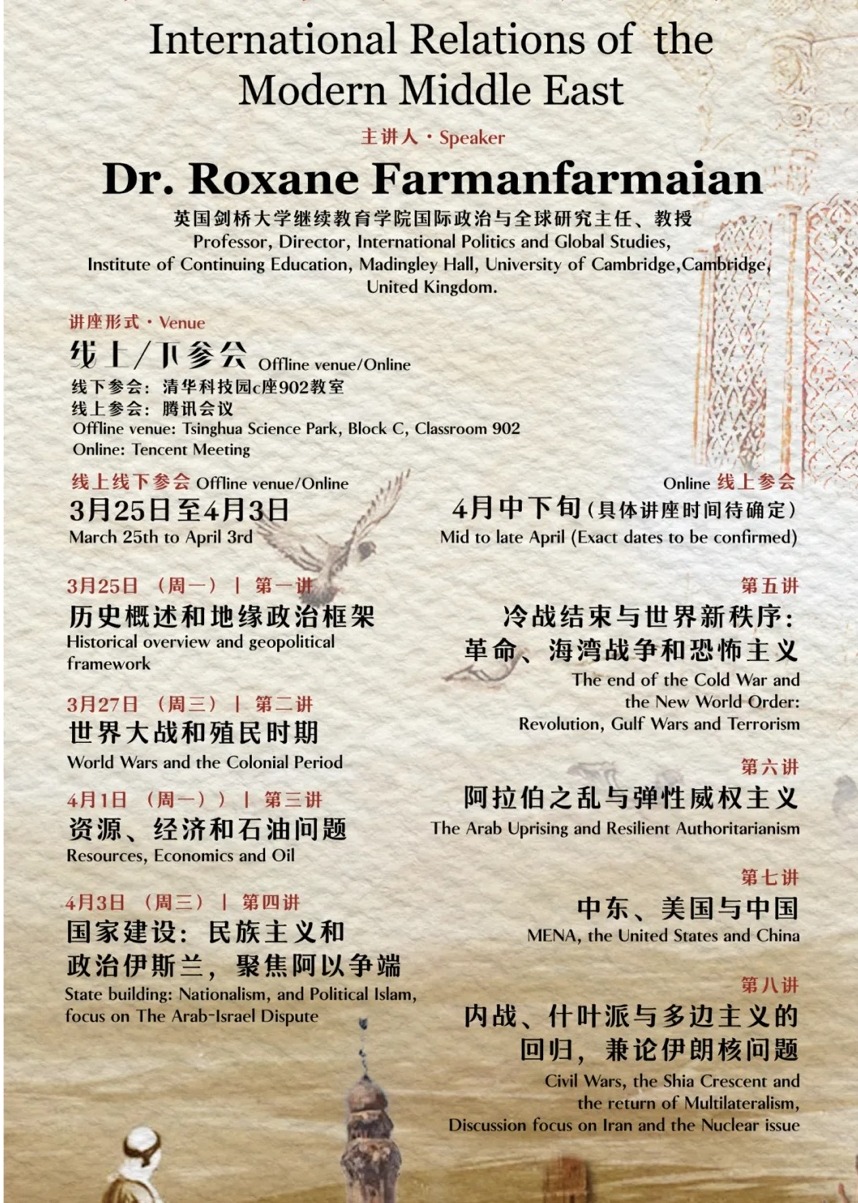 From March 25 to April 24, 2024, the Institute for International and Area Studies at Tsinghua University invited Professor Roxane Farmanfarmaian, Director of International Politics and Global Studies at the Institute of Continuing Education, University of Cambridge to conduct a series of eight lectures on "International Relations of the Modern Middle East." The topics of the lectures were: "His...