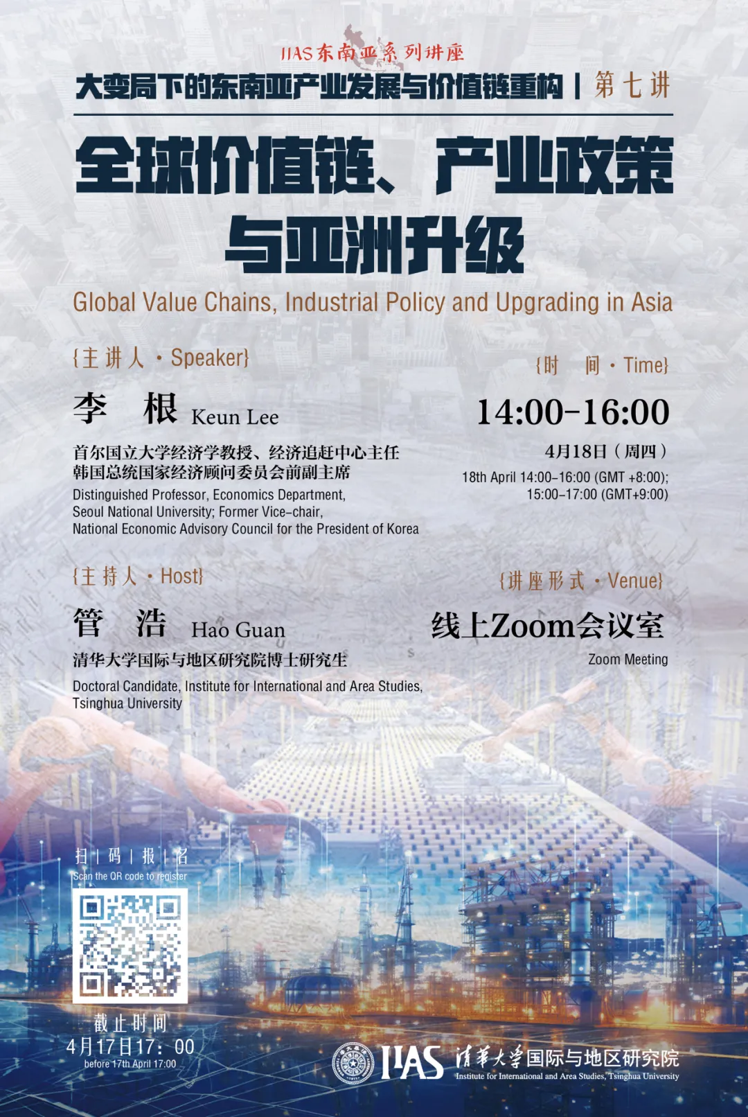 On April 18, 2024, the Institute for International and Area Studies of Tsinghua University invited Keun Lee, Professor of Economics and Director of the Center for Economic Catch-up at Seoul National University, and former Vice Chairman of the National Economic Advisory Council of the President of South Korea, to give the seventh online lecture in the series of lectures on "Industrial Development and Value Chain Reconstruction in Southeast Asia under Great Changes", with the theme of "Global Value Chain, Industrial Policy and Asian Upgrading". This lecture was hosted by Guan Hao, a doctoral student at the Institute for International and Area Studies of Tsinghua University, and attended by more than 100 teachers and students from domestic and foreign universities and professionals interested in the topic.