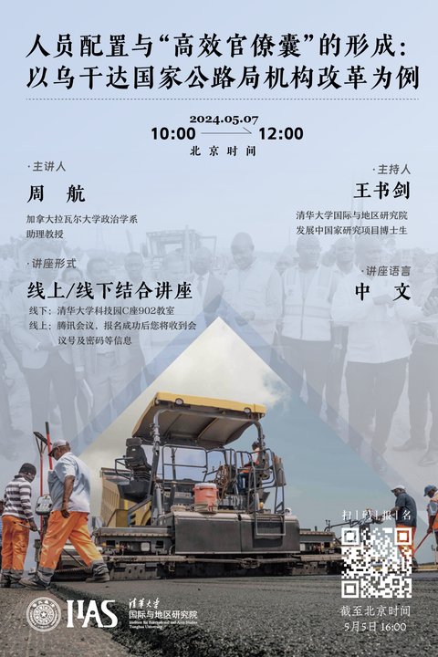 On May 30, 2024, from 10:00 am to 12:00 pm, the Sub-Saharan African Studies Research Group of the Institute for International and Area Studies (IIAS) at Tsinghua University hosted the second lecture of the 20223-2024 spring semester “Staffing and the formation of an 'Pockets of Effectiveness': the case of institutional reform in the Uganda National Roads Authority”. The lecture was held both online and offline and was delivered by Dr. Zhou Hang, Assistant Professor in the Department of Political Science, Laval University, Canada. The event was moderated by Mr. Wang Shujian, a PhD Candidate in the Developing Country Studies Program at IIAS, Tsinghua University.