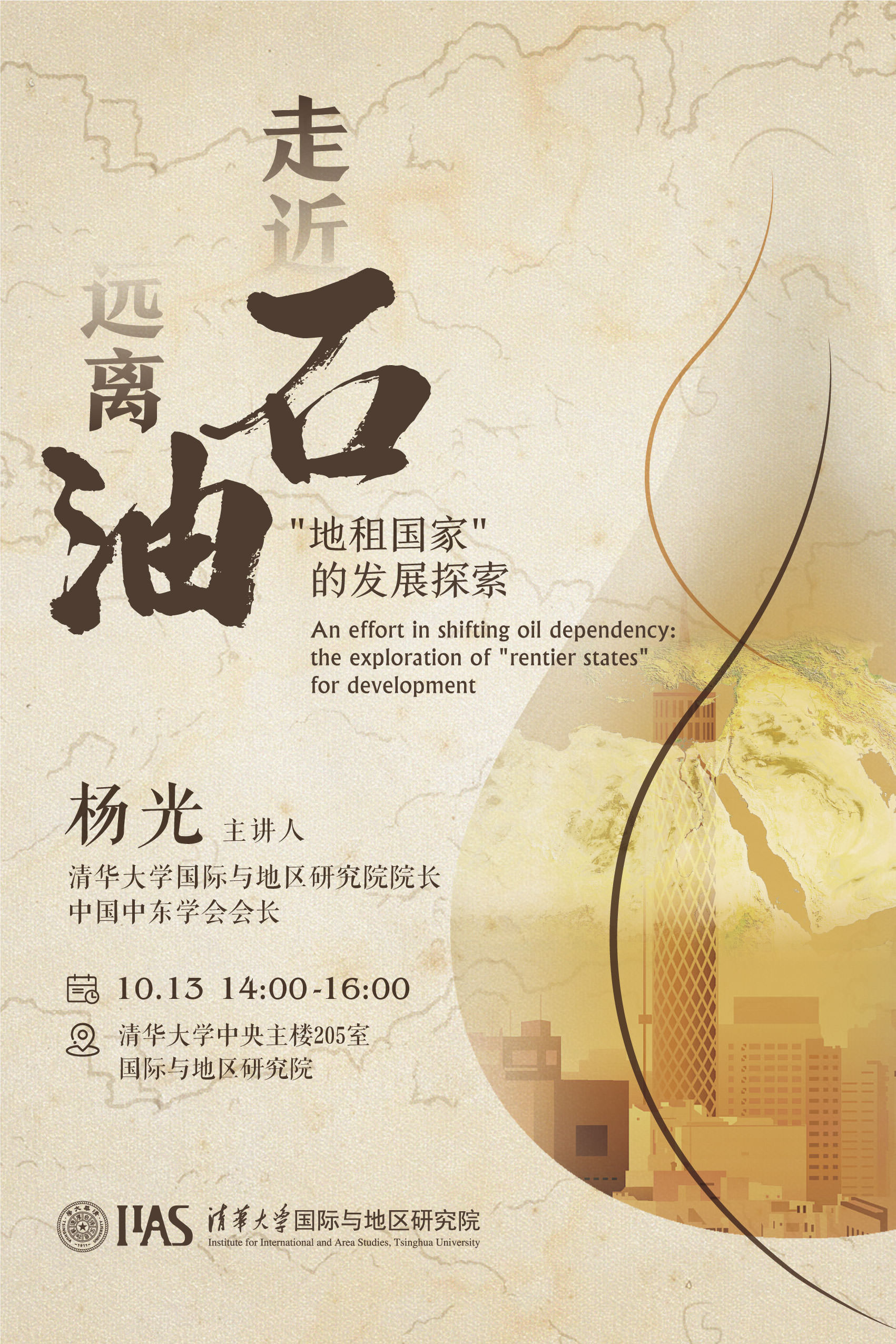 院长、中国中东学会会长杨光教授在清华大学中央主楼205室发表了题为“走近石油·远离石油:‘地租国家’的发展探索”主题讲座,为地区院师生深度解读了中东 “地租国家”发展历史与经济模式。杨光教授以宏观理论与微观数据相辅助、政治学与经济学相结合的方式,为本院师生交叉学科式地区研究提供了范式。本场讲座也是地区院“多元中东”学术系列讲座的首场,地区院助理研究员王霆懿主持讲座。