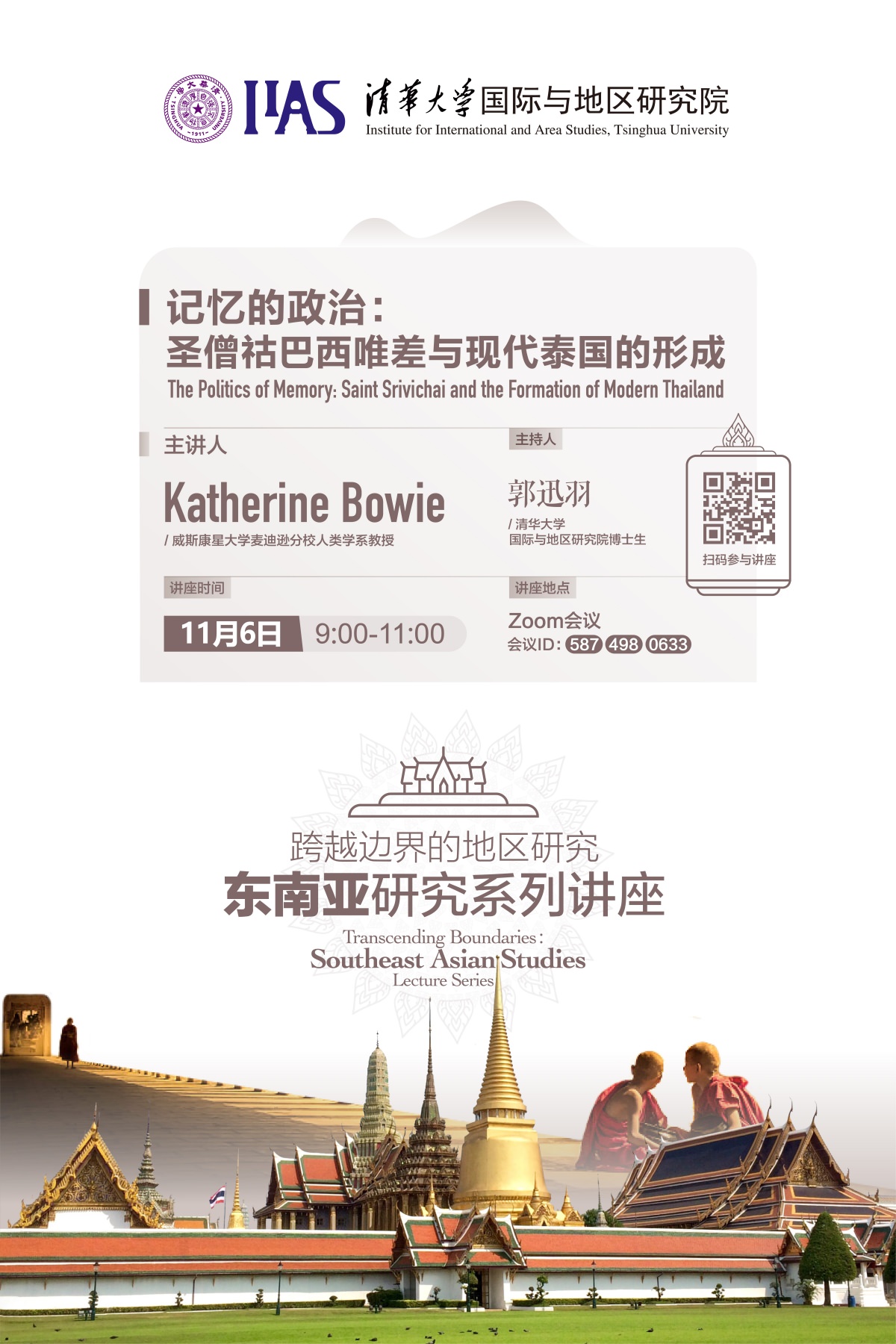 2020年11月6日上午, “跨越边界的地区研究:东南亚研究系列讲座”迎来了第五位嘉宾,来自威斯康星大学麦迪逊分校人类学系的Katherine Bowie教授为大家带来了主题为“记忆的政治:圣僧祜巴西唯差与现代泰国的形成”的讲座。多多博彩(中国区)唯一官方网站