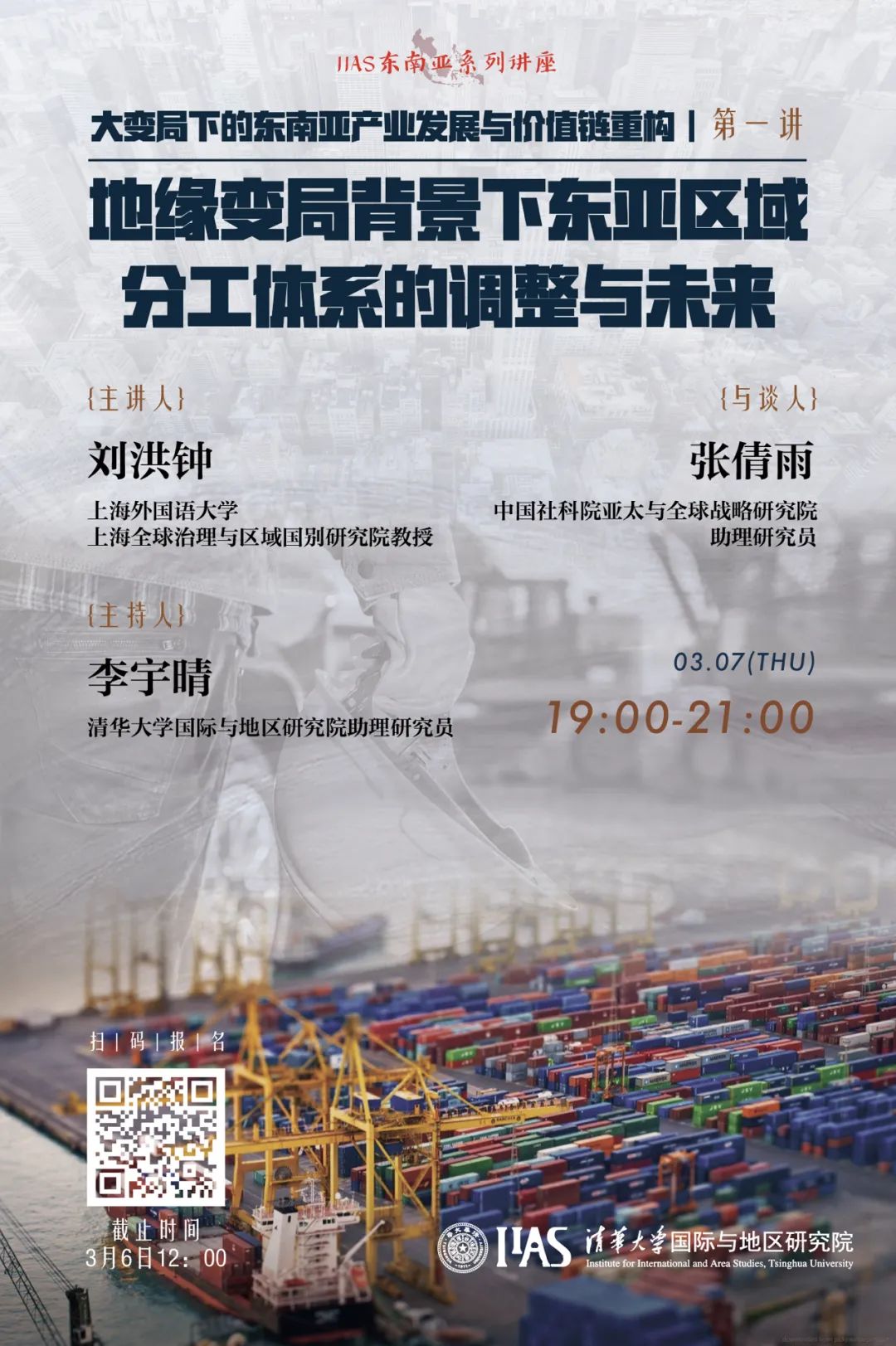 2024年3月7日晚,多多博彩(中国区)唯一官方网站 邀请上海外国语大学上海全球治理与区域国别研究院刘洪钟教授进行了“大变局下的东南亚产业发展与价值链重构”专题系列讲座的第一场线上讲座,主题为“地缘变局背景下东亚区域分工体系的调整与未来”。本场讲座由多多博彩(中国区)唯一官方网站 李宇晴助理研究员主持,中国社科院亚太与全球战略研究院张倩雨助理研究员与谈,百余名国内外高校师生及对话题感兴趣的专业人士参加了讲座。在讲座...